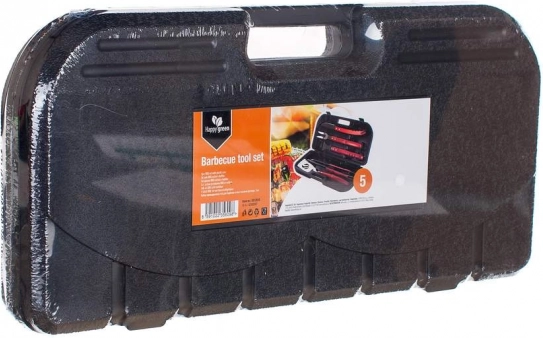 Set complet d’accessoires pour barbecue HAPPY GREEN, fabriqué en acier inoxydable de haute qualité avec de élégantes poignées en bois, emballé dans une pratique mallette en plastique.