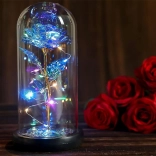 Rose éternelle sous cloche en verre avec éclairage LED – lampe décorative bleue et arrangement cadeau