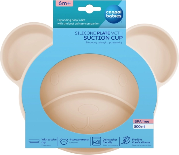 L’assiette compartimentée en silicone Canpol babies Ourson aide les enfants à apprendre à manger seuls. Ses quatre compartiments encouragent une assiette variée, la séparation des saveurs et des textures, et motivent l’enfant à essayer de nouveaux aliments. La ventouse puissante empêche l’assiette de se renverser ou de glisser de la table ou de la chaise haute.