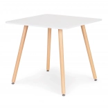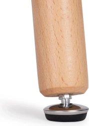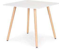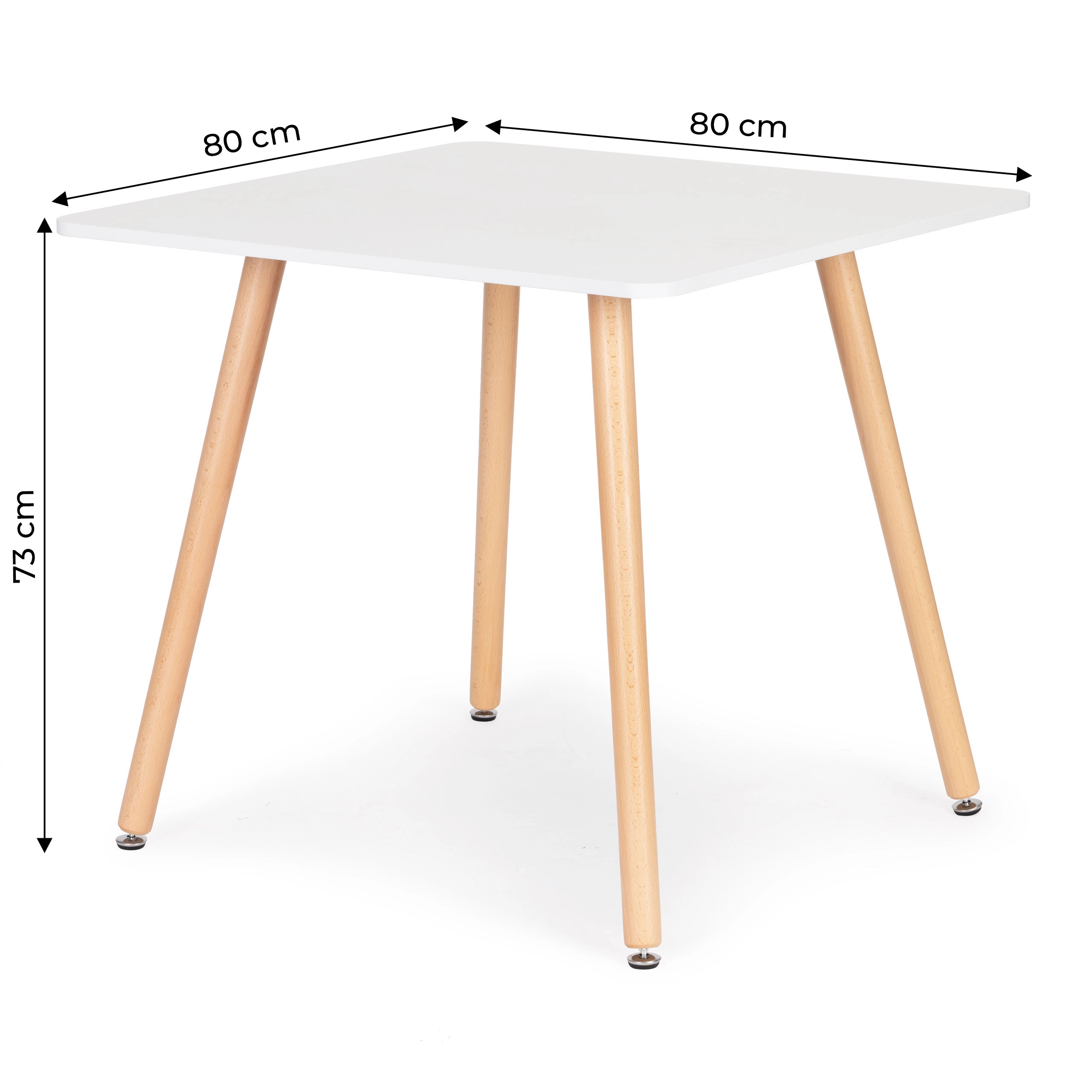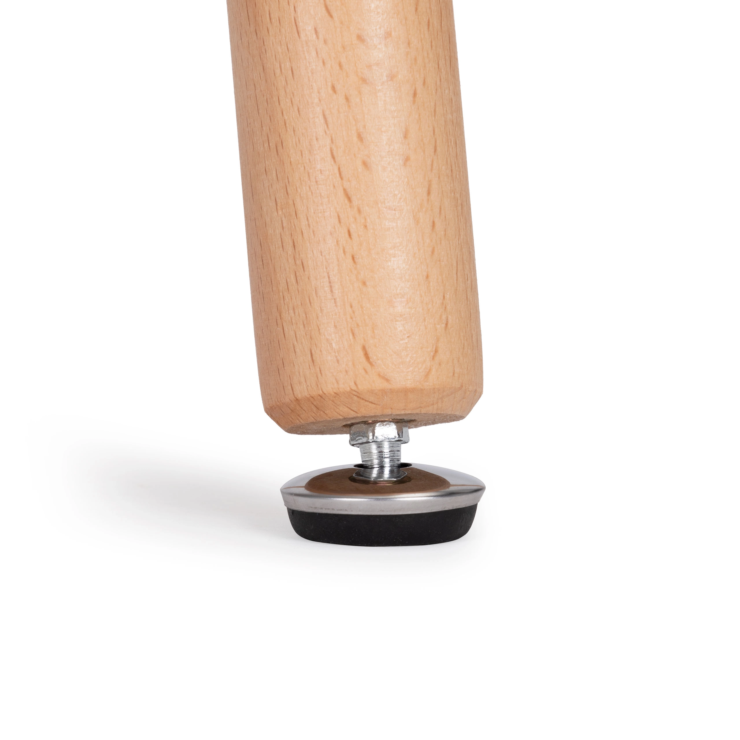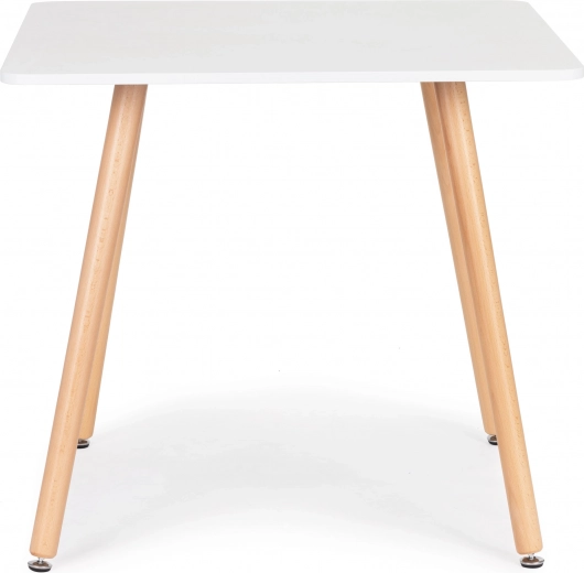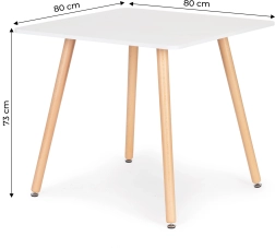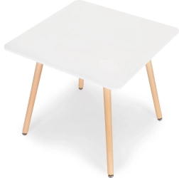 Les pieds de la table sont en bois de hêtre résistant. À leurs extrémités, des patins mobiles spéciaux aident à mettre la table de niveau et protègent le sol des rayures. Le plateau est en panneau MDF recouvert d’un placage blanc mat résistant, sous lequel se trouve un cadre métallique accueillant les pieds de la table.