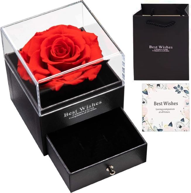 Boîte avec couvercle transparent, révélant la beauté de la rose éternelle. Élégant noir avec l'inscription 'Best Wishes', ajoutant une touche de luxe.