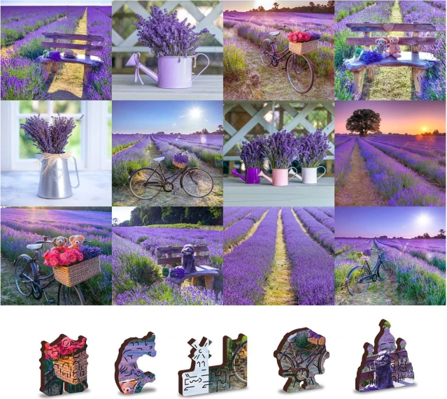 Le puzzle est recto-verso, permettant un assemblage selon le motif lavande ou selon le motif régulier au verso.