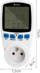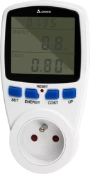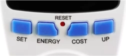 La sécurité est assurée par une alarme de surcharge avec seuil de puissance maximale réglable. La commande est rapide et intuitive grâce à seulement quatre boutons (SET, ENERGY, COST, UP). Il suffit de le brancher à la prise, de connecter l’appareil et vous savez immédiatement combien coûte réellement son fonctionnement.