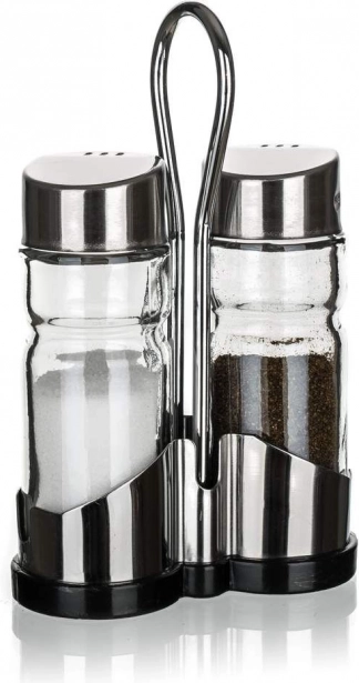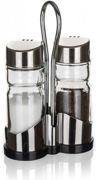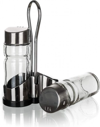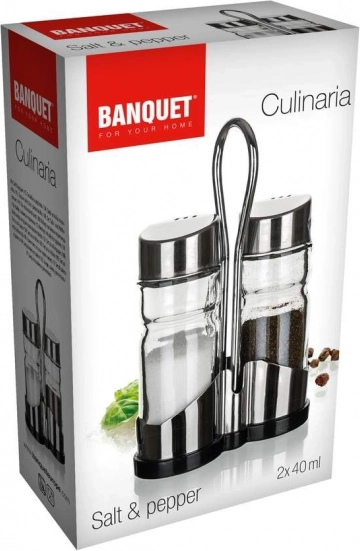 Le set Banquet pour sel et poivre comprend deux récipients en verre de 40 ml, placés dans un support métallique. Cette combinaison de contenants en verre avec couvercles argentés apportera du style à votre table tout en assurant un assaisonnement facile des plats.