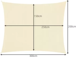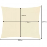 Bâche d’ombrage rectangulaire 3×2 m en polyester résistant avec œillets métalliques, offrant une protection efficace contre le soleil et, en partie, contre la pluie. Elle procure une ombre agréable, améliore la circulation de l’air et sèche rapidement. Grâce aux anneaux de montage et aux cordelettes, vous pouvez la tendre facilement sur la terrasse, au jardin ou sur le balcon. Matériau déperlant, installation facile et multiples options de fixation pour un confort optimal en plein air.