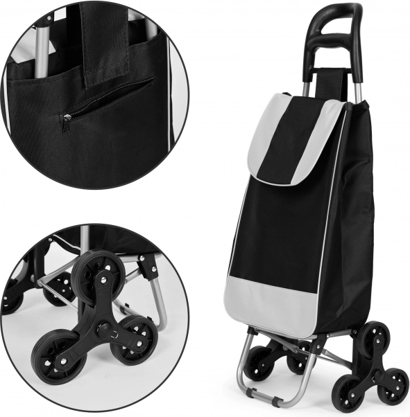 Le chariot est équipé de roues triples en caoutchouc pour surmonter facilement les obstacles tels que les trottoirs ou les escaliers, permettant de transporter facilement vos achats avec un effort minimal.