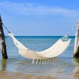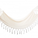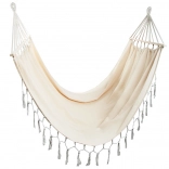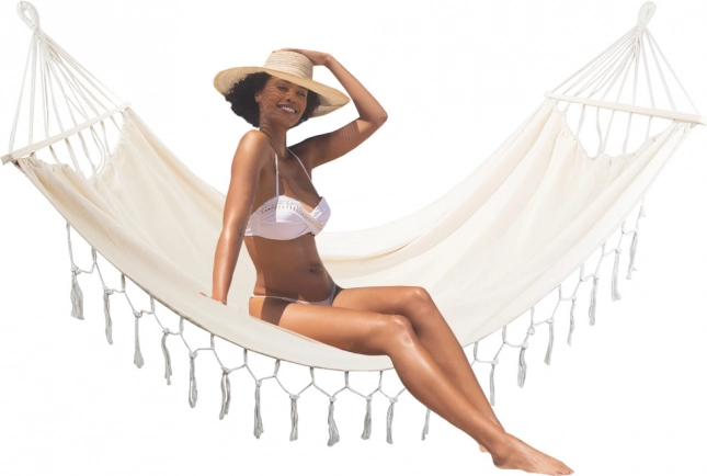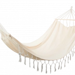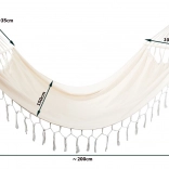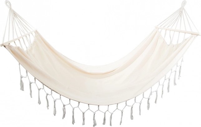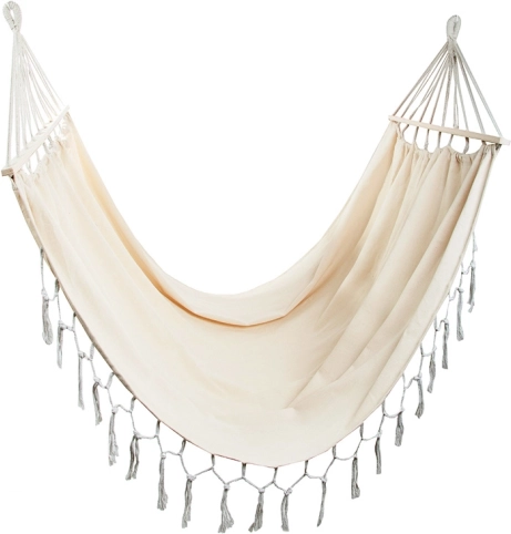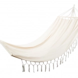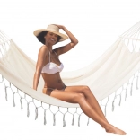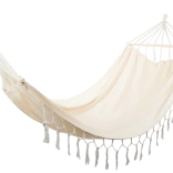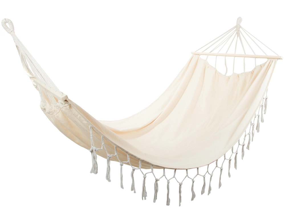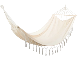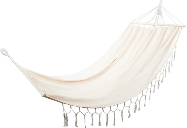 Ce hamac bohème est idéal pour les couples comme pour les personnes seules qui aiment le confort et le style. La large surface de couchage avec barres d’écartement maintient le tissu bien déployé, pour vous installer confortablement et profiter du calme au jardin, sur le balcon ou en vacances.