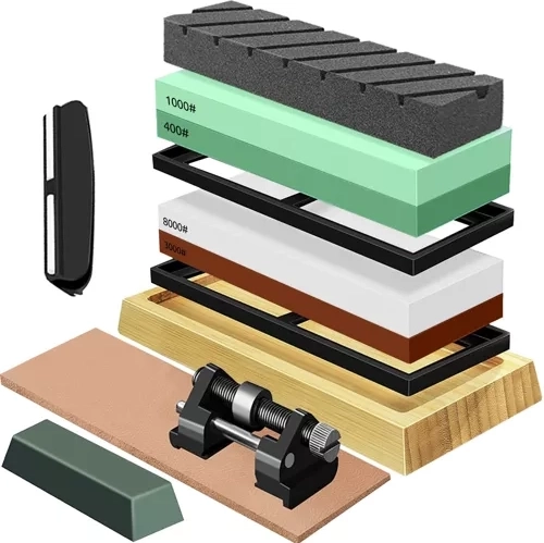 - 4 pierres à aiguiser (400/1000/3000/8000), 2 tapis en caoutchouc, base en bambou antidérapante, sangle en cuir et support pour polissage, pâte à polir, guide pour ciseaux à bois/couteaux, guide de tranchant, pierre de dressage, boîte colorée, carton de transport
