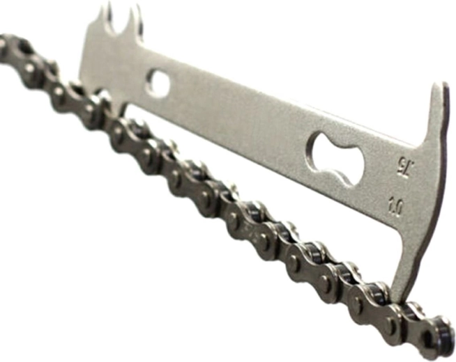 Outil compact pour contrôler l’état d’usure de la chaîne de vélo. Très facile à utiliser : insérez simplement l’extrémité arrondie de la jauge dans un maillon de la chaîne et appuyez l’autre extrémité de l’outil sur la chaîne tendue. La jauge indique le degré d’usure sur des repères à 75 % et 100 %. Si l’extrémité de la jauge ne s’insère pas entre les maillons, cela signifie que la chaîne est en parfait état.