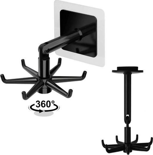 Crochet de cuisine autocollant avec six crochets sur un support rotatif. Montage facile et non invasif grâce au ruban adhésif, permettant l’installation du crochet sous un meuble comme sur un mur.