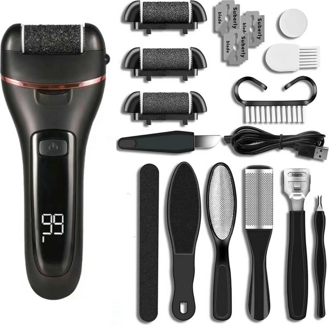 Râpe électrique pour talons, idéale pour éliminer l’excès de peau durcie des pieds. Elle est équipée d’une batterie intégrée, d’une lampe d’éclairage LED et d’un écran LCD lisible, ce qui facilite grandement l’utilisation. Sa conception fine et compacte assure une prise en main ferme pour travailler sans fatigue. Le coffret comprend 3 têtes de ponçage de grains différents (2 grossières et 1 fine) ainsi qu’une série d’accessoires supplémentaires tels que des brosses et des limes pour des soins plus précis.