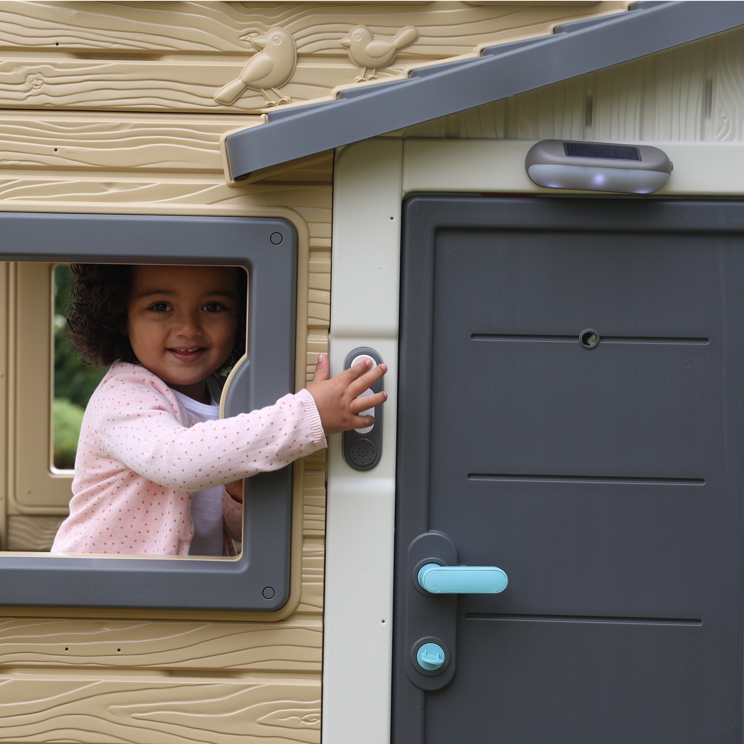 En appuyant sur le bouton, un clair « ding-dong » retentit pour stimuler le jeu interactif et l’accueil des invités à la maisonnette.