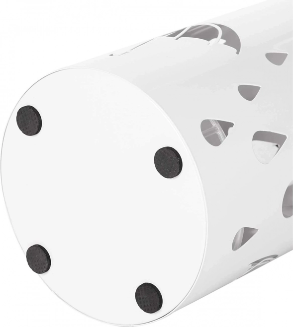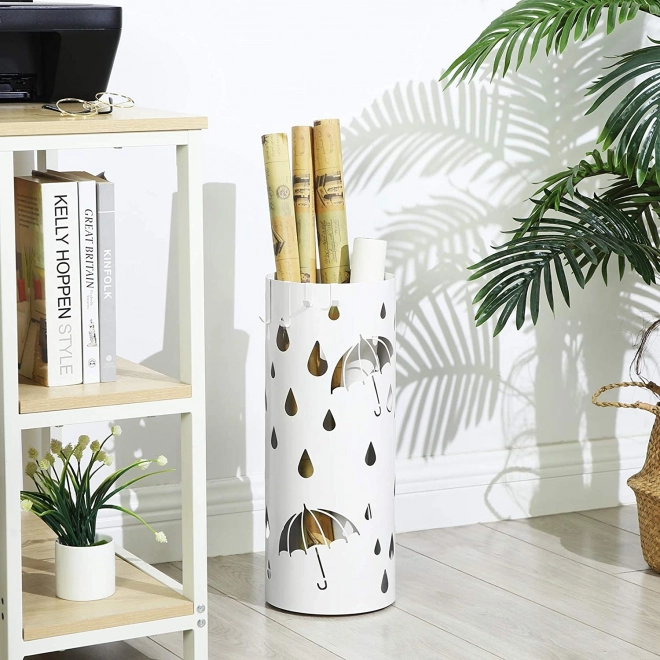 Élégant porte-parapluies blanc, complément idéal pour votre intérieur. Son design moderne et sa structure métallique ouverte apportent une touche stylée qui séduira chaque visiteur. La couleur blanche et les découpes décoratives en forme de parapluies et de gouttes de pluie subliment l’entrée ou le couloir.