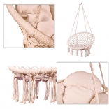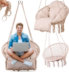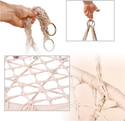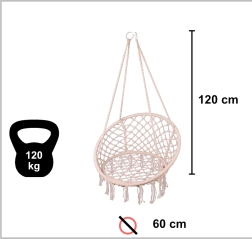 Ce fauteuil suspendu offre une assise confortable pour des moments de repos et de doux balancements. Sa grande forme circulaire et son coussin moelleux favorisent une posture ergonomique, tandis que les cordes en coton tressé et le cadre métallique assurent fiabilité et longue durée de vie.