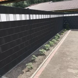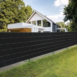 La bande noire opaque crée un écran élégant, améliore le confort acoustique et protège du vent. Idéale pour les clôtures à panneaux et les balcons.