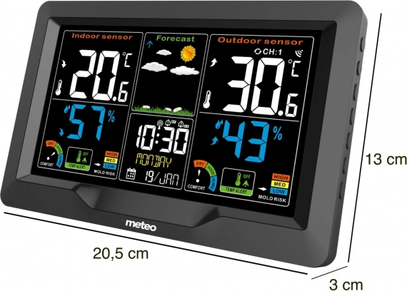 Station météorologique domestique Meteo est un appareil hautement équipé pour surveiller la météo. Il offre une mesure sans fil de la température et de l'humidité. Il prédit le temps à l'aide d'icônes et propose un indicateur de confort pratique.