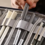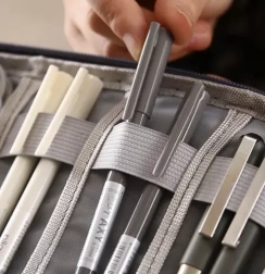 À l’intérieur, vous trouverez 6 poches en mesh pour un repérage rapide et 8 bandes élastiques pour un maintien ferme de vos accessoires. La fermeture zippée protège le contenu, le rembourrage en mousse absorbe les chocs et la dragonne facilite le transport. Idéal pour le travail, les études et les voyages.