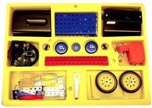 - Pièces métalliques, vis, écrous, roues/chenilles en plastique