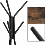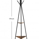 Portemanteau sur pied stylé au design loft, combinant métal et bois, idéal pour l’entrée, le dressing, le salon et le couloir. Il offre 6 crochets arrondis pour manteaux et accessoires, 2 étagères pratiques et un socle trépied stable. Une structure en fer robuste et un MDF résistant garantissent une longue durée de vie, tandis que des patins de sécurité protègent le sol.