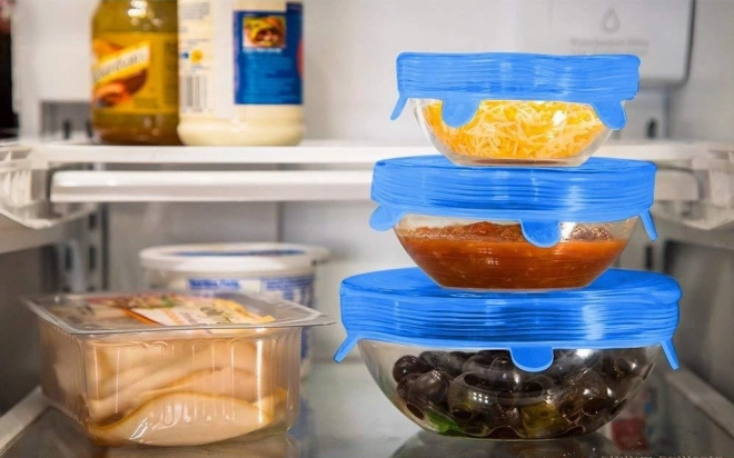 Six couvercles de diamètres variés couvrent verres, bols, casseroles et même des fruits entamés – des petits pots jusqu’aux grands saladiers.