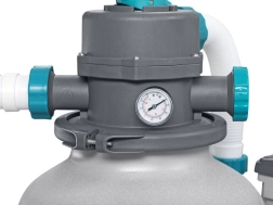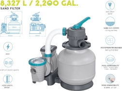 Avec un débit de 8 327 litres par heure, elle convient aux piscines d’une capacité de 1 100 à 54 500 litres. Pour fonctionner, elle nécessite du sable silice n° 20 (0,45–0,85 mm) ou des billes de filtration hautement efficaces POLYSPHERE.