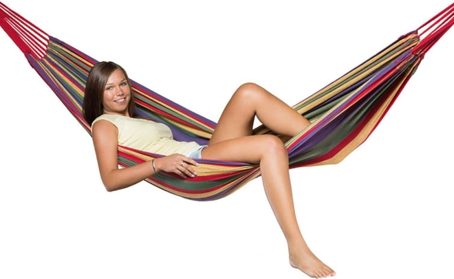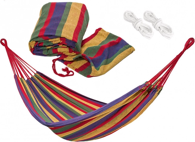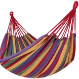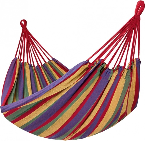 Ce hamac confortable au motif rayé et joyeux est idéal pour le jardin, le balcon et l’intérieur. Il suffit d’attacher ses deux extrémités à des points fixes – arbres, crochets ou poteaux – pour vous balancer et vous relaxer agréablement à l’air libre.