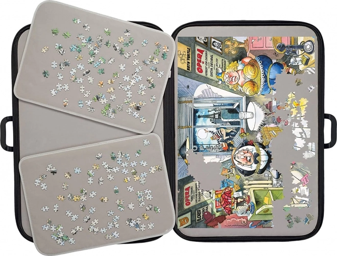 Pratique chemise portable pour puzzles de 500 à 1000 pièces de la marque JUMBO, vous permettant d’assembler, de ranger en toute sécurité et de reprendre à tout moment. Grâce à sa surface antidérapante, sa fermeture zippée et sa poignée confortable, vous gardez votre puzzle en cours en sécurité et le transportez facilement. L’emballage comprend également deux plateaux séparés pour trier les pièces.