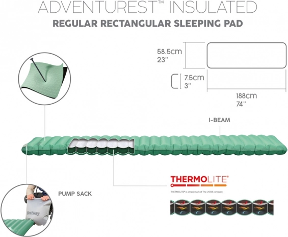 Le matelas gonflable Bestway AdventuRest combine confort et fonctionnalité, ce qui en fait un choix parfait pour les séjours en pleine nature. Il est fabriqué en matériau résistant ToughLite avec un tissu ripstop qui protège contre les percées. Une couche isolante ThermoLite assure légèreté et chaleur.