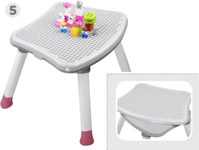 - 6 fonctions en 1 : chaise haute avec plateau, rehausseur pour chaise de repas, chaise basse avec plateau, chaise + table, table avec plateau pour briques, tabouret bas