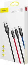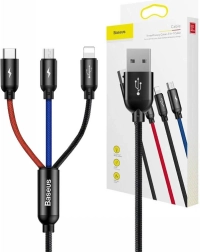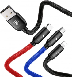 Vous cherchez une solution compacte et fiable pour charger plusieurs appareils ? Le câble Baseus 3‑en‑1 avec connecteurs USB‑C / Lightning / Micro USB remplace plusieurs câbles à la fois. Des branches différenciées par couleur facilitent l’orientation rapide, la gaine en nylon améliore la résistance et les embouts en aluminium garantissent une longue durée de vie. La longueur de 0,3 m est idéale pour une powerbank, la voiture ou le bureau, sans excès de câble.