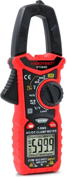 Multimètre pince numérique professionnel HABOTEST HT206D offrant des mesures précises avec la technologie True RMS, détection de tension sans contact NCV, filtre LPF pour alimentations à découpage et écran LCD rétroéclairé lisible. Grâce aux mâchoires Ø 26 mm, aux mesures de tensions et courants AC/DC, de résistance, de capacité, de fréquence et de température, il est idéal pour les électriciens comme pour un usage hobby exigeant.