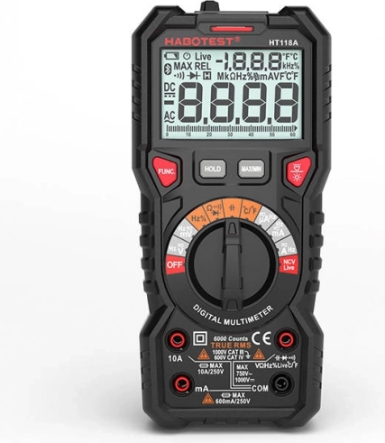 Le HABOTEST HT118A mesure les tensions et courants continus et alternatifs, la résistance, la capacité, la fréquence, le facteur de service ainsi que la température dans une large plage de -40 °C à 1000 °C. La fonction True RMS garantit des résultats plus précis avec des formes d’onde non linéaires, tandis que le NCV permet de détecter rapidement et en toute sécurité la présence de tension sans toucher le conducteur.