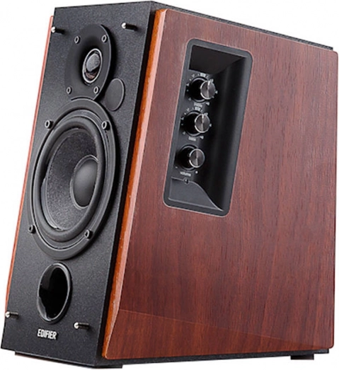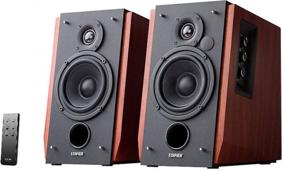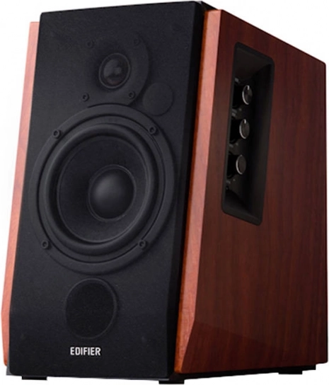 Élégantes enceintes bibliothèque 2.0 avec coffret en bois EDIFIER R1700BT offrant un son puissant et clair, une connexion Bluetooth sans fil, le DSP et DRC pour réduire la distorsion, ainsi qu’un contrôle pratique via télécommande et molettes latérales. La façade inclinée orientée vers l’auditeur garantit une projection optimale et des basses percutantes grâce à l’évent bass-reflex frontal.