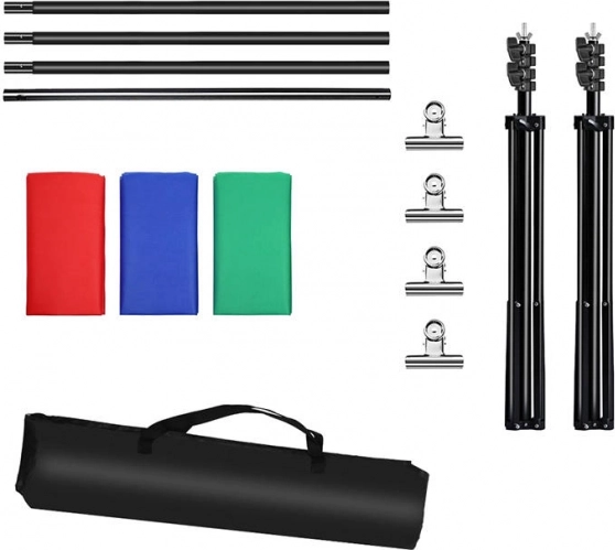 Le set comprend trois arrière-plans dans de belles couleurs : rouge, vert et bleu. Parfait pour différents types de photographie et enregistrements vidéo.