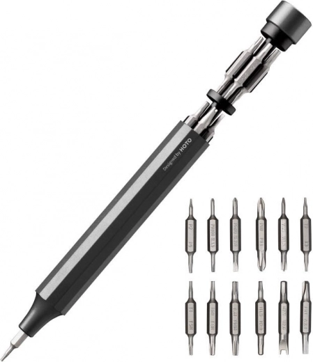 Le tournevis HOTO est équipé d'une pointe magnétique pour faciliter l'insertion et le retrait des embouts. Le design ergonomique assure un confort de travail sans glissement. Avec un poids de seulement 110 g et des dimensions comparables à un stylo à bille, il est facile de l'emporter partout.