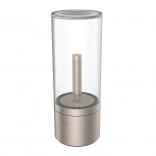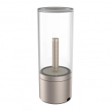 La commande est intuitive : en tournant la partie supérieure, vous réglez la luminosité, et via l’interrupteur sur la base, vous sélectionnez le mode flamme ou la lumière constante. La batterie intégrée de 2500 mAh tient jusqu’à 100 heures au niveau le plus bas (environ 9,5 h au plus haut), la recharge se fait via USB‑C. Son design minimaliste, avec corps en verre et accents métalliques, s’intègre à tout intérieur.