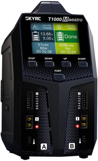 Le SkyRC T1000 Maestro est un nouveau chargeur de modèles RC incroyablement performant, qui se distingue par une puissance allant jusqu’à 450 W (AC) ou même 1000 W (DC). Il utilise un cœur avancé Arm Cortex-M4 et est équipé d’un écran couleur qui fournit les informations essentielles concernant son fonctionnement. Il permet d’utiliser 2 ports simultanément et se transporte sans difficulté. Un logiciel dédié, Charger Master, est également disponible et offre encore plus de possibilités.