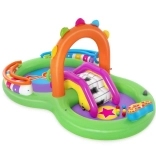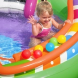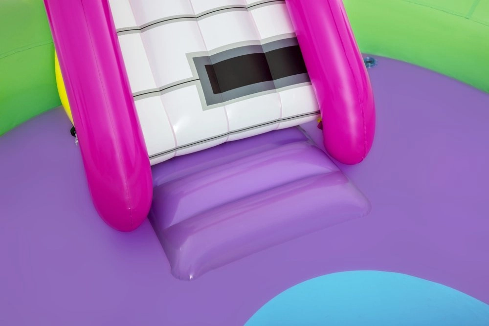 Contenu: 1 petit bassin, 1 toboggan, 1 tambour, 2 anneaux gonflables, 1 microphone, 6 balles colorées, 1 rustine de réparation.
