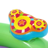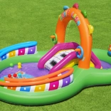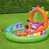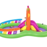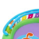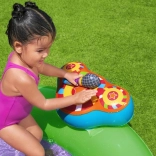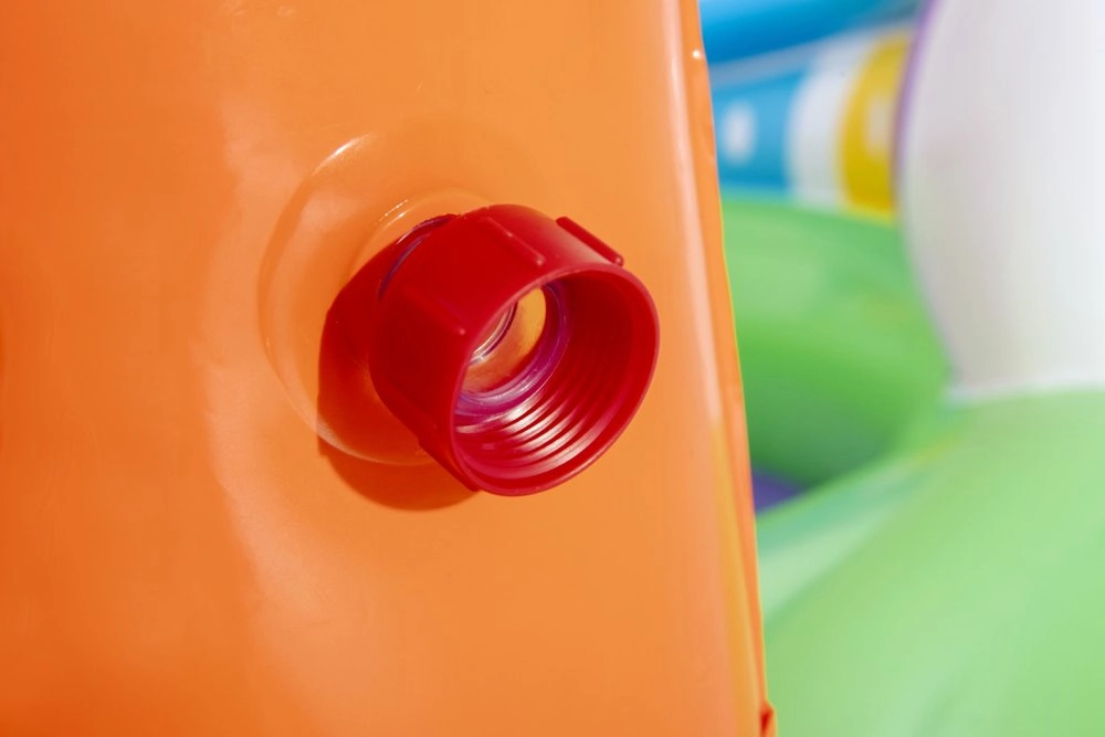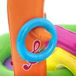 Explorez et profitez de nombreuses fonctions ludiques avec le centre de jeux aquatique gonflable Sing and Splash. Le centre de jeux comprend un microphone et un tambour avec lesquels les enfants peuvent s’amuser et stimuler leur imagination. Deux bassins reliés sont équipés d’un toboggan amovible fixé par cordes et boucles. Un coussin gonflable intégré dans le sol assure un atterrissage en douceur au bas du toboggan. L’arceau avec asperseur intégré se raccorde simplement à un tuyau d’arrosage. On peut lancer des anneaux gonflables sur les pointes de l’arceau. Le set comprend 6 balles colorées que vous pouvez faire descendre sur l’une ou l’autre rampe. Ces jeux sont non seulement amusants, mais développent aussi la coordination œil-main.