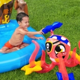 La pieuvre gonflable colorée et les éléments ludiques transforment la petite piscine en aire de jeux aquatique interactive.