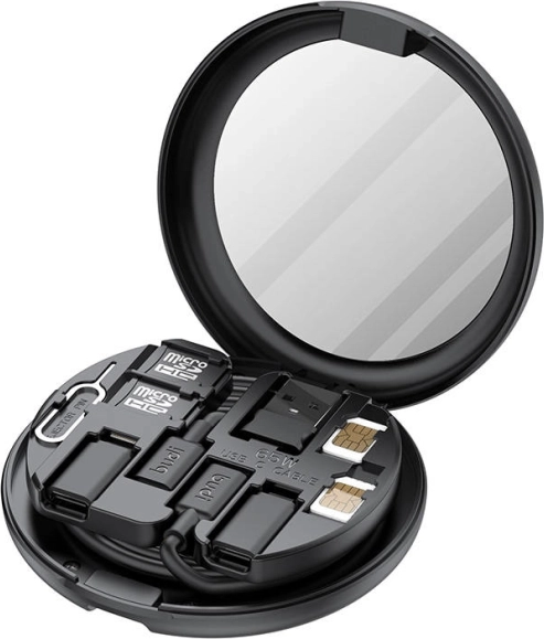 - Organiseur 12‑en‑1 – logements SIM/microSD, support de téléphone, miroir, câble et adaptateurs.