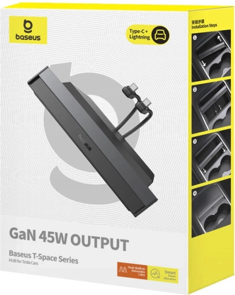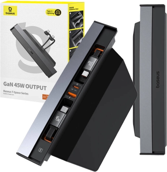 Baseus T‑Space est un hub élégant et pratique conçu spécialement pour l’intérieur des voitures TESLA (Model 3 et Y – prise en charge du transfert de données). Il dispose de deux câbles USB‑C rétractables (0,8 m) avec embouts magnétiques pour un rangement net, et de deux ports supplémentaires USB‑C et USB‑A. Il peut ainsi alimenter jusqu’à 4 appareils simultanément – des smartphones et tablettes aux écouteurs et manettes de jeu.