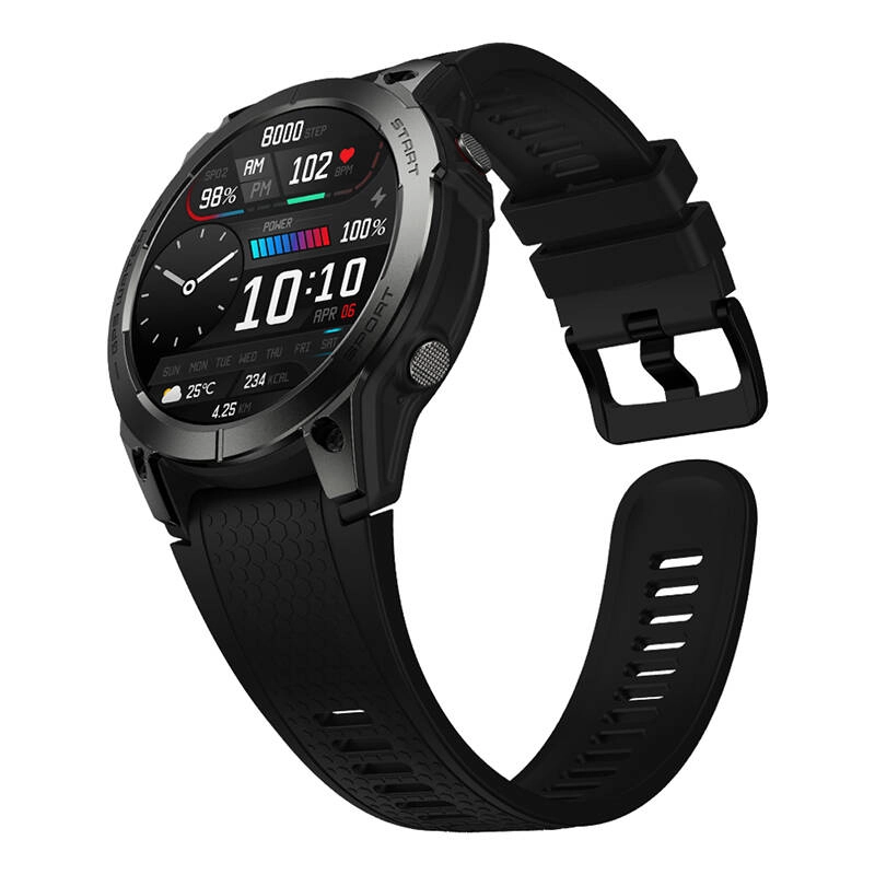Conception robuste en alliage de zinc avec revêtement carbone, étanchéité IP68 et batterie 400 mAh offrant jusqu’à 45 jours en veille, jusqu’à 20 jours en mode entraînement éco et jusqu’à 84 heures avec GPS et mesure du rythme cardiaque. Recharge en environ 1,5 heure. Compatibilité Android et iOS via l’application Zeblaze Fit pour une gestion simple des données.