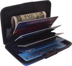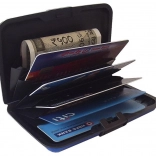La couche extérieure est fabriquée en aluminium, qui empêche le scan indésirable des puces. L'intérieur à soufflet avec 6 compartiments offre un rangement parfait pour les cartes et cartes de visite. Ouverture et fermeture faciles grâce à un bouton pratique.