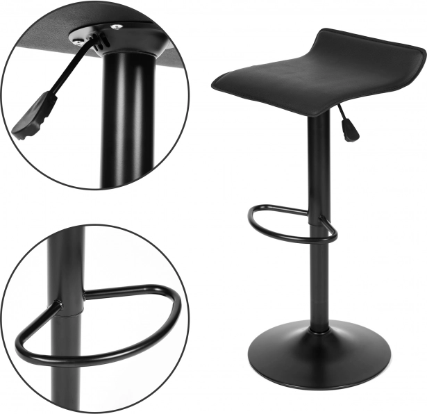 • Le confort d’assise est assuré par un siège profilé, fini par un simili cuir résistant à l’abrasion. Grâce au vérin pneumatique, chacun peut facilement régler la hauteur du tabouret pour être confortablement assis à table ou au bar. Sous le siège se trouve une poignée dédiée permettant de baisser ou relever le siège.
