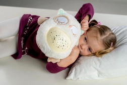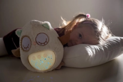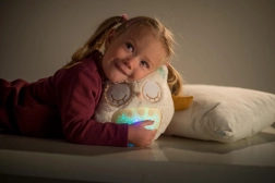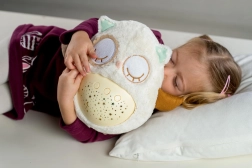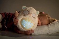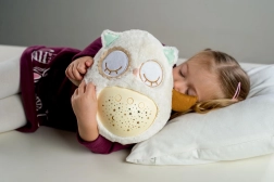 Ce doudou en peluche ultra doux associe l’étreinte chaleureuse à des fonctions intelligentes pour faciliter l’endormissement. Le hibou projette un ciel étoilé en 8 couleurs, diffuse 8 berceuses ainsi que des sons prénataux apaisants auxquels les tout-petits sont habitués dans le ventre de maman. Une fois la mélodie terminée, la lumière reste douce encore environ une minute puis s’éteint automatiquement.