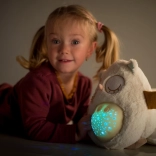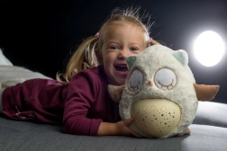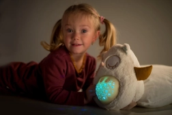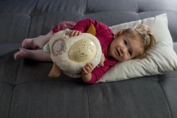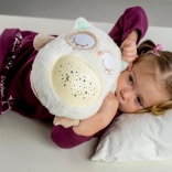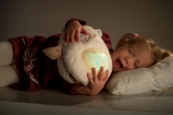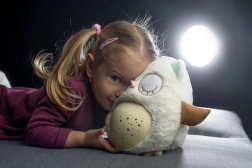 Le petit hibou projette un ciel nocturne en 8 teintes colorées qui créent une atmosphère propice à l’endormissement et apaisent les sens de bébé.