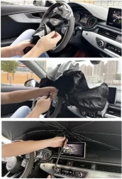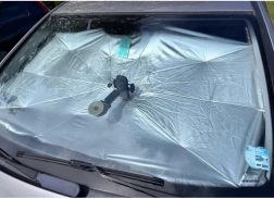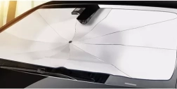 Le pare-soleil se déploie comme un parapluie et se fixe facilement à l'intérieur du pare-brise. Un revêtement spécial argenté reflète les rayons du soleil, gardant l'intérieur de la voiture au frais.