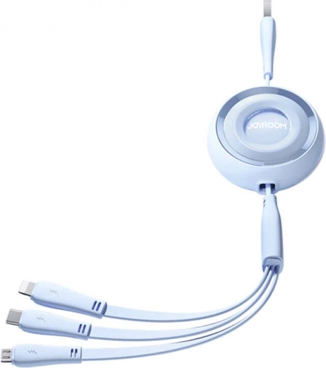 Câble universel 3‑en‑1 de la marque JOYROOM avec connecteurs USB‑C, Lightning et Micro USB, permettant de charger jusqu’à 3 appareils simultanément. Il offre une charge rapide et sûre 3,5 A, une longueur pratique de 1 m et une conception rétractable pour garder de l’ordre et faciliter le transport. La construction robuste en PC+TPE garantit une longue durée de vie.