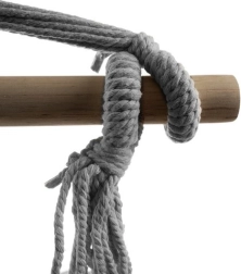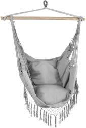La barre d’écartement en bois répartit la charge uniformément, rendant le fauteuil bien équilibré et stable. La corde de suspension robuste avec anneau de montage permet une suspension facile et une utilisation sûre. Le colis comprend 2 coussins 40 × 40 cm qui augmentent le confort d’assise.